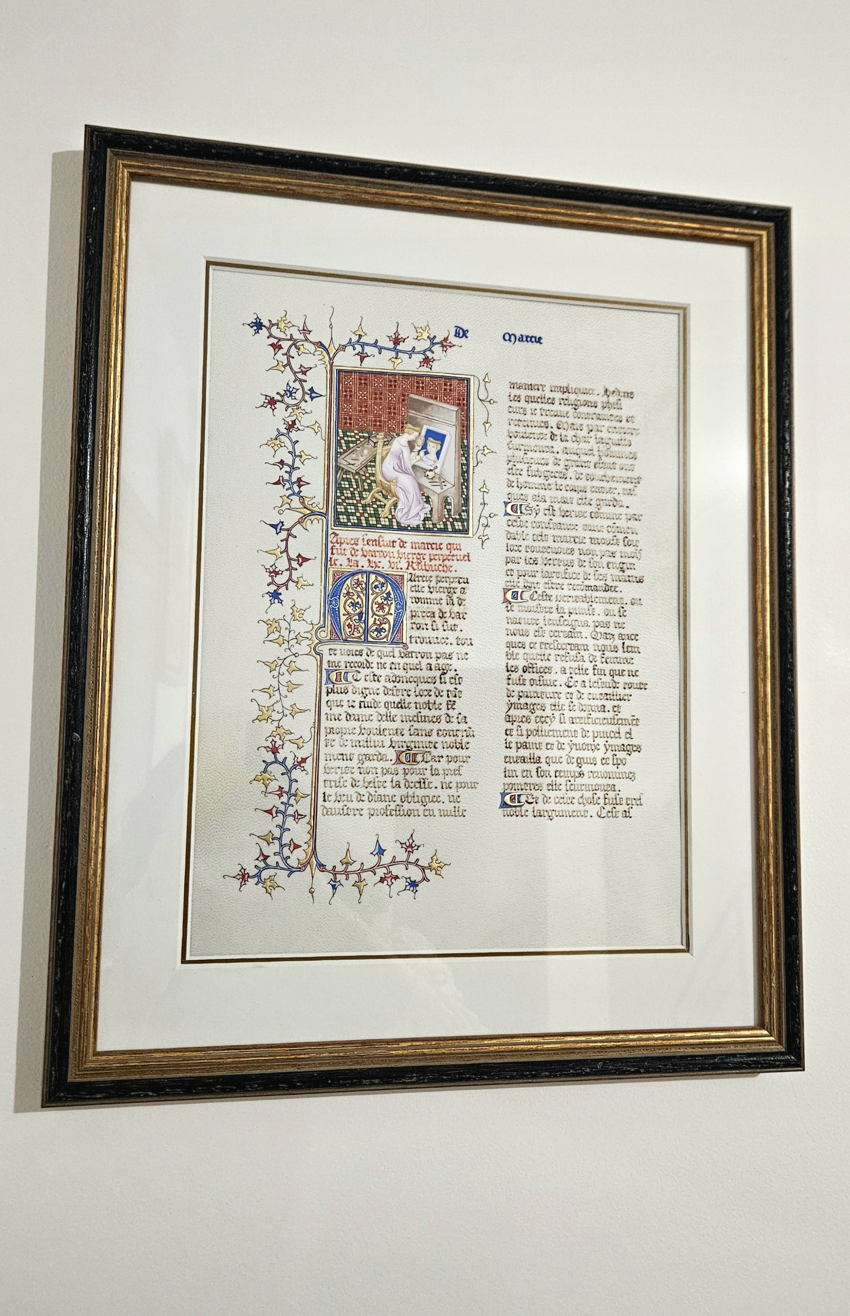 Enluminure inspirée d’un vitrail représentant l' »Archange Saint-Michel terrassant Satan ». Enluminure sur parchemin, pigments liés à la détrempe, or 22 carats.